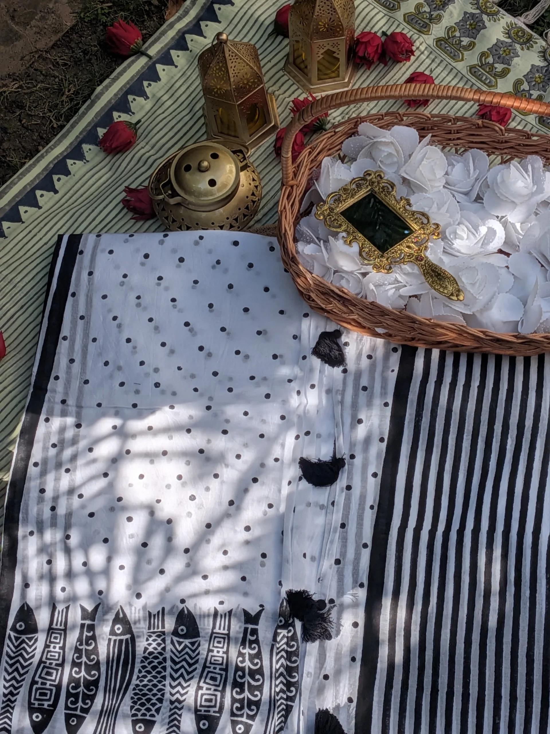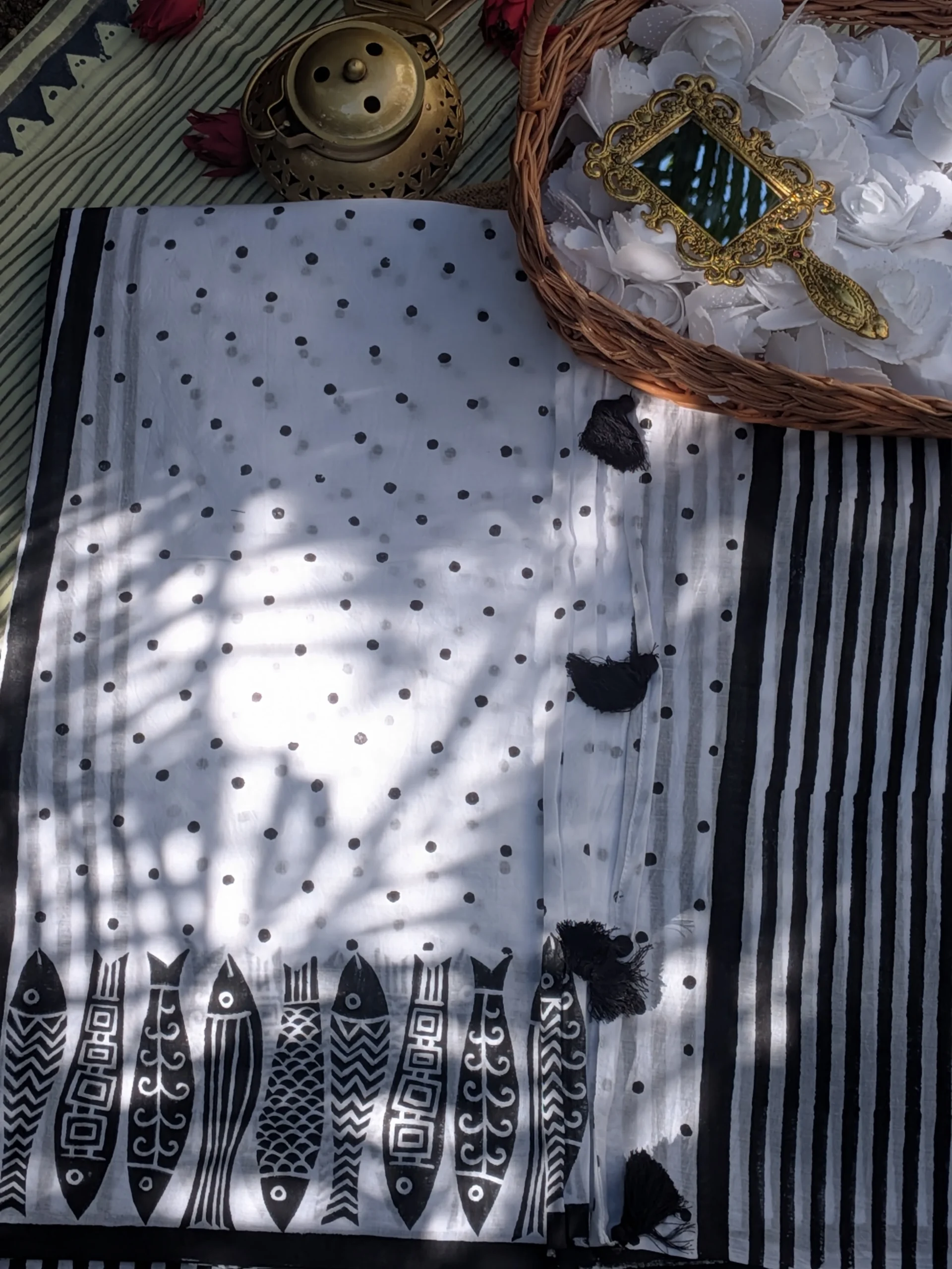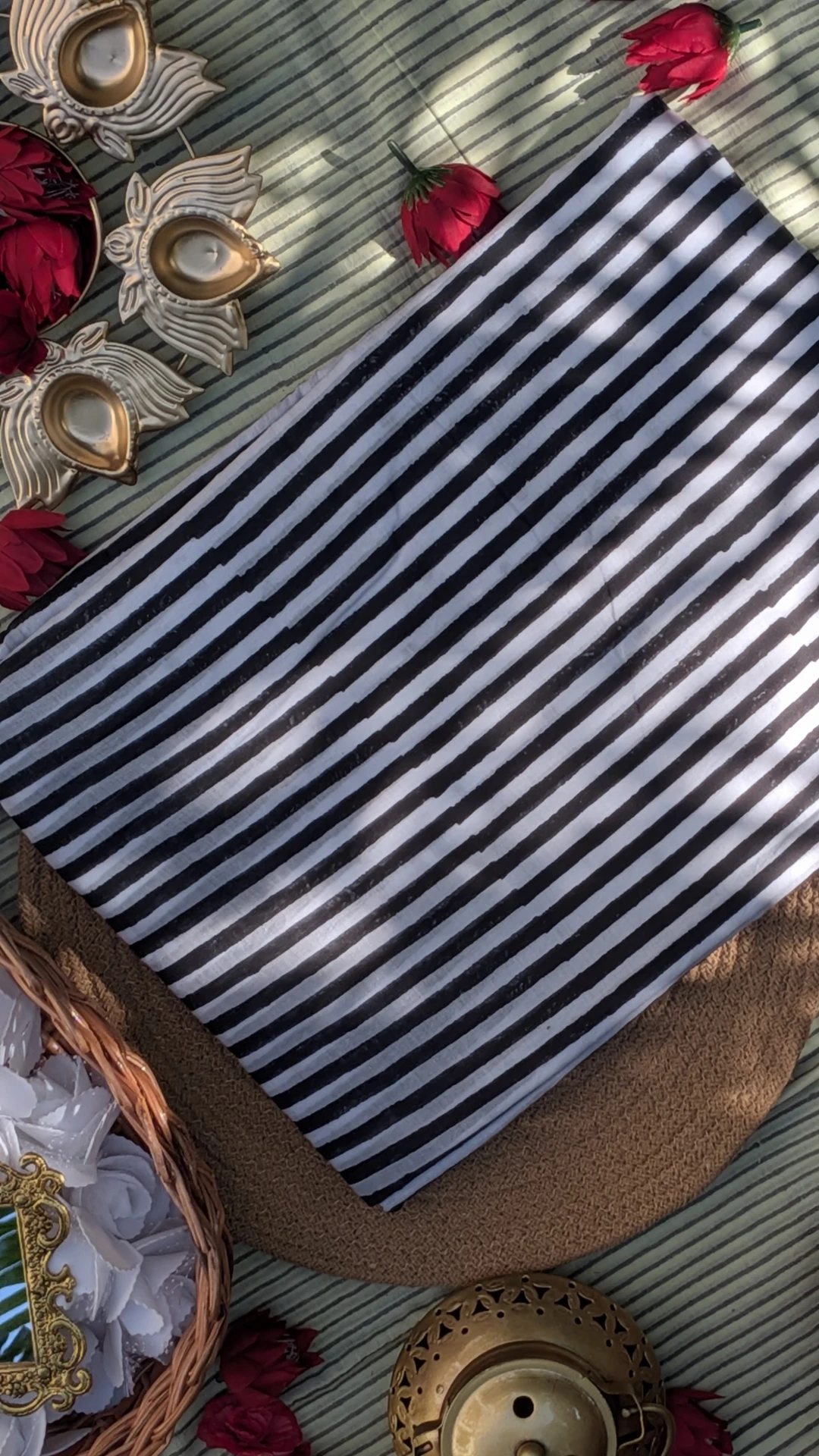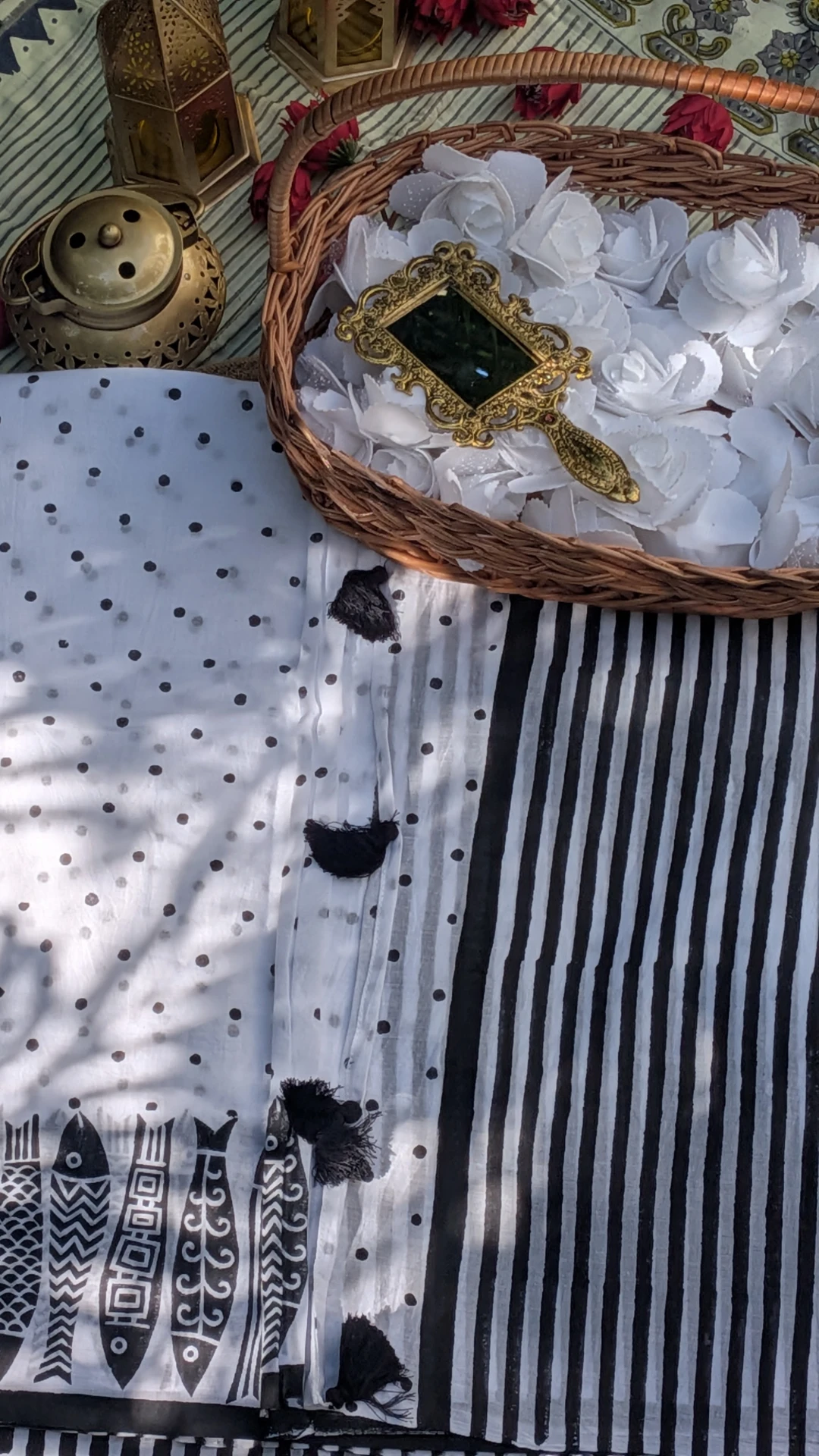 Eclectic Patterns: A unique composition that seamlessly blends classic linear stripes with playful polka dots and hand-blocked fish motifs—a traditional symbol of prosperity and flow.