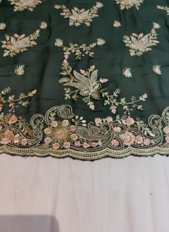 Intricately adorned with thread embroidery, zari detailing, and delicate stone work, the saree adds a subtle sparkle while maintaining a graceful, sophisticated look. The rich green hue symbolizes freshness and elegance, making it a timeless addition to your ethnic wardrobe.